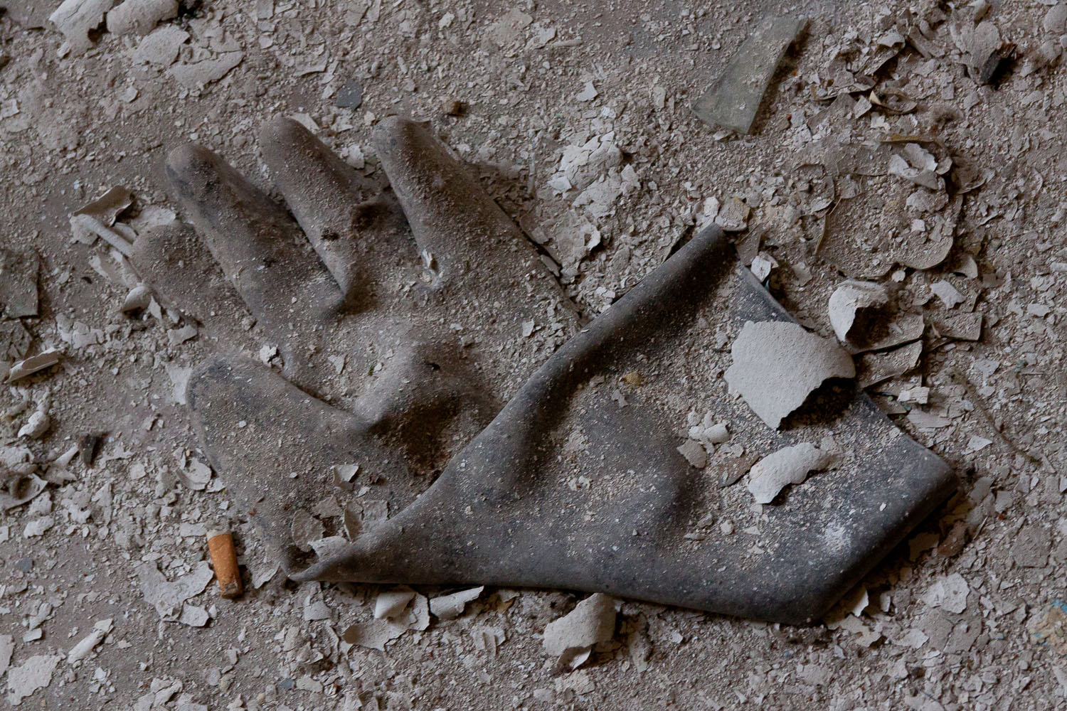 Gelegentlich findet man Reste von Schutzausrüstungen, wie diesen Chemie-Handschuh.