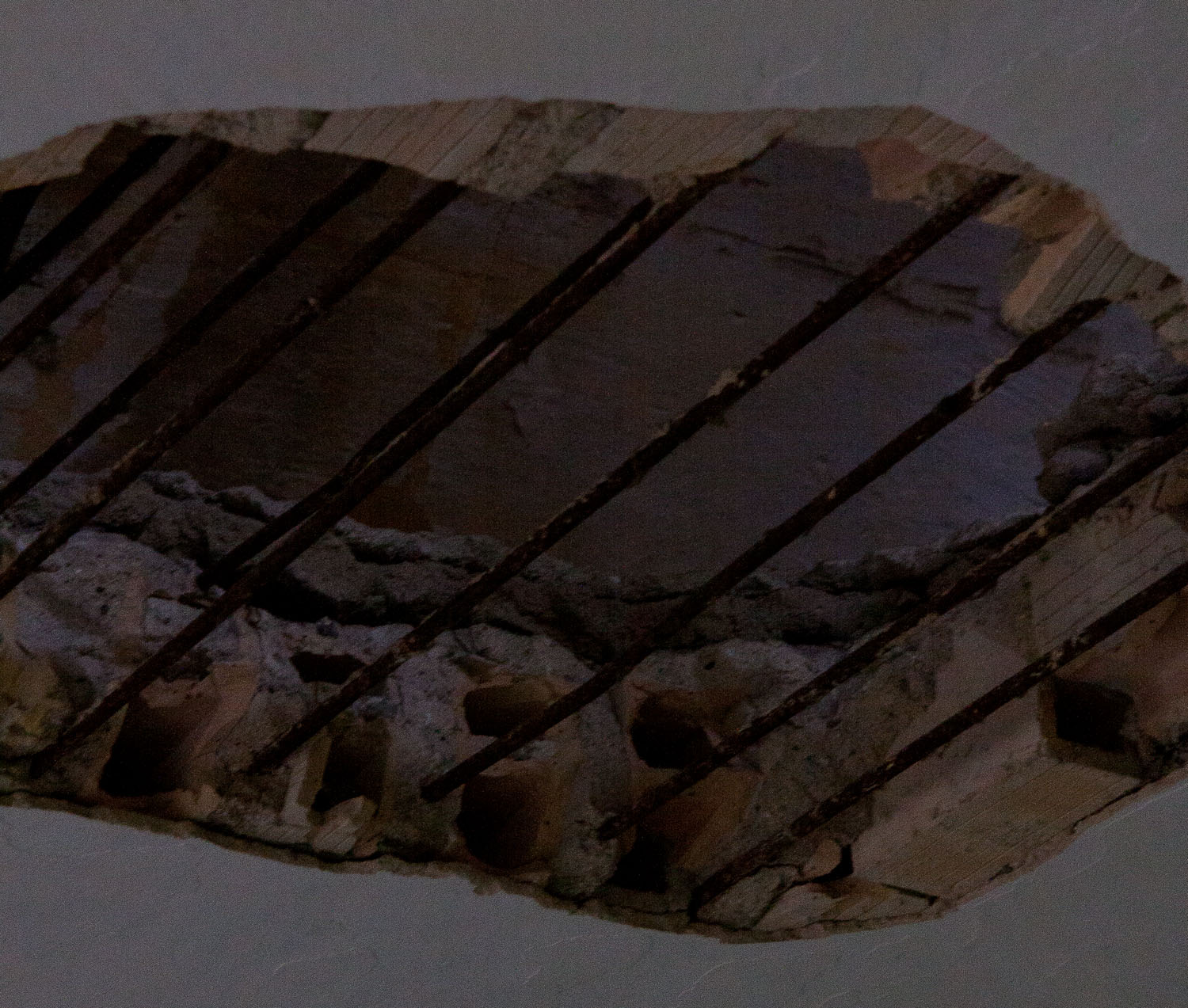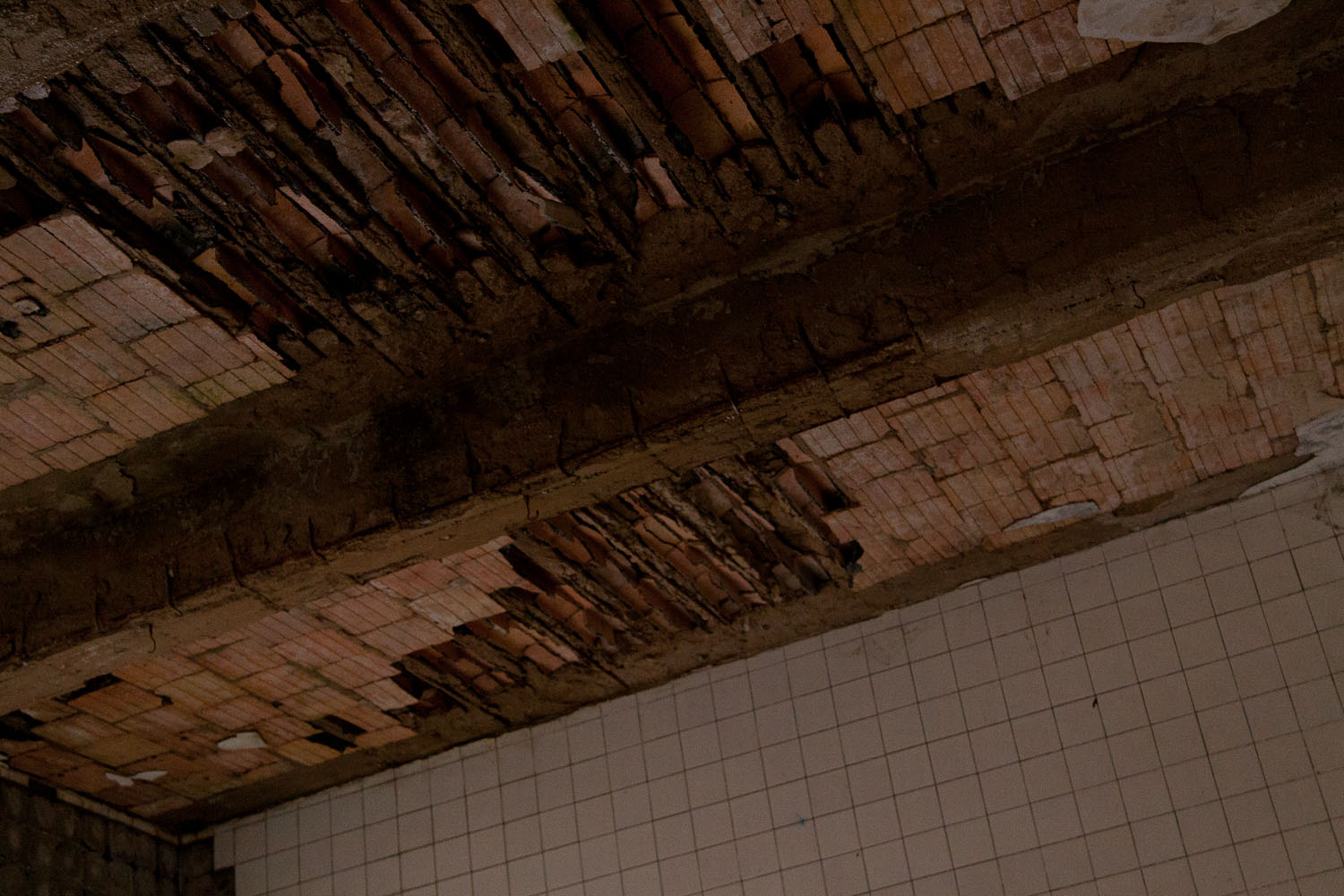 Hier lösen sich quadratmeterweise die Deckenverkleidungen ab.