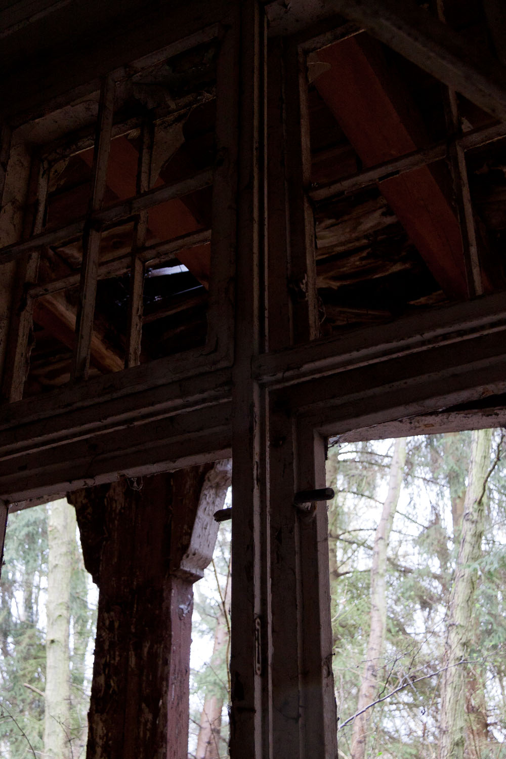Die Veranda ist holzgedeckt. Die Balken sind verrottet, nur ein paar senkrecht stehende Stützen sehen noch ganz gut aus. Interessant wieder die Übermalung mit Farbtönen, wie wir sie überall in ehemaligen Liegenschaften der GSSD vorfanden (braun, grün, hellblau ...).