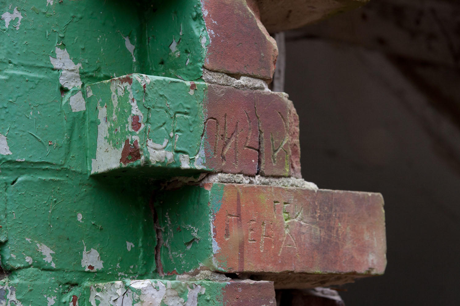 Nahaufnahme vom "Russen-Grün" und von einigen eingeritzten Namen.