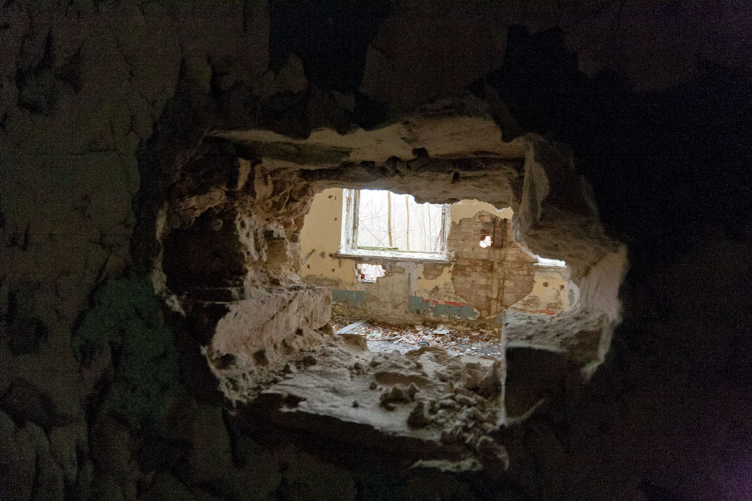 In manche Wände waren Löcher geschlagen. Vermutlich haben hier Paintballer gespielt, obwohl es keine wahrnehmbaren Farbkleckse gab.