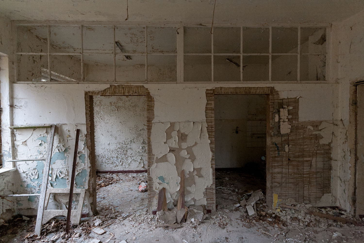 In vielen Räumen scheint jemand schon Fenster-Teile ausgebaut zu haben: sonst stünden die nicht so ordentlich aufgereiht an der Wand.