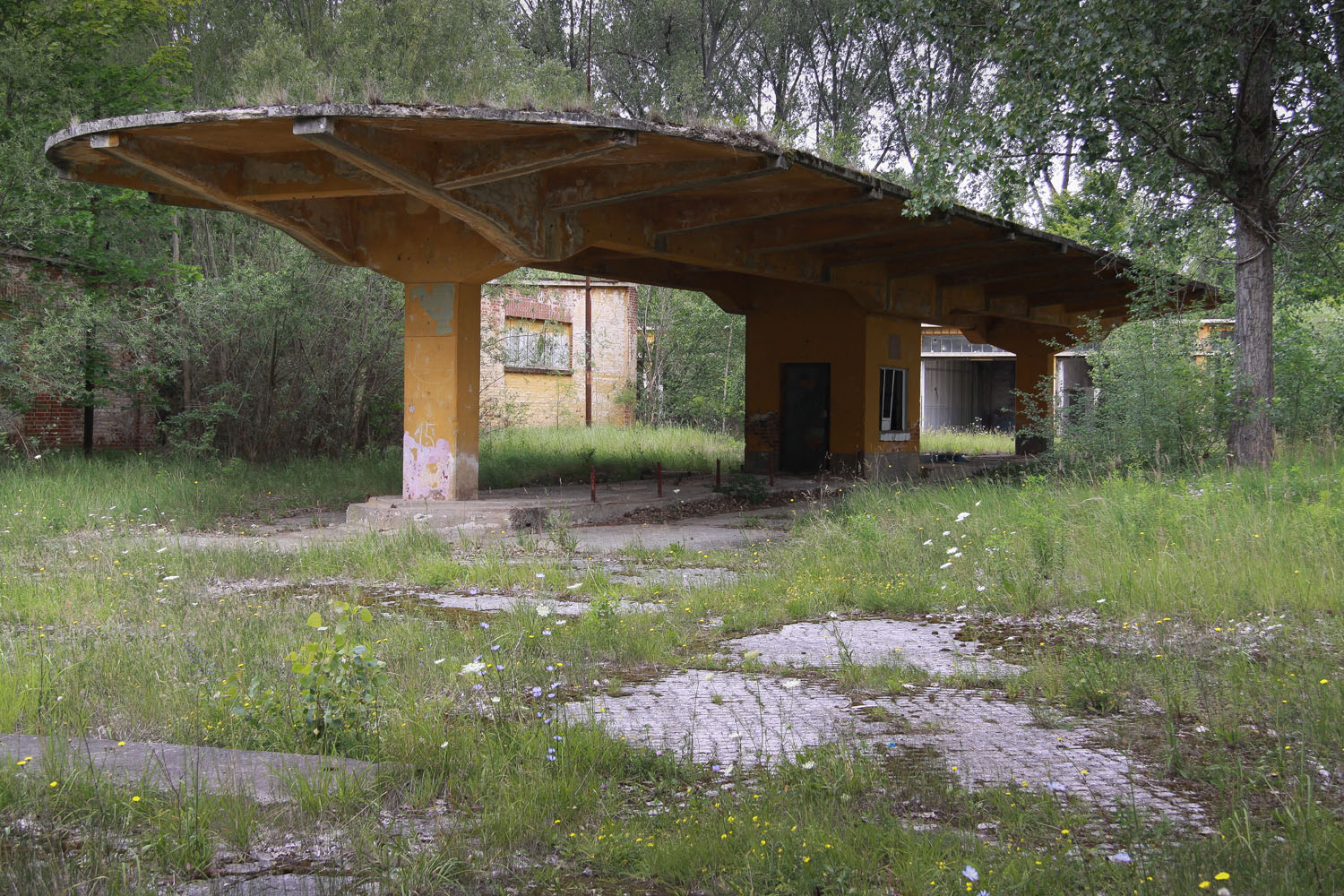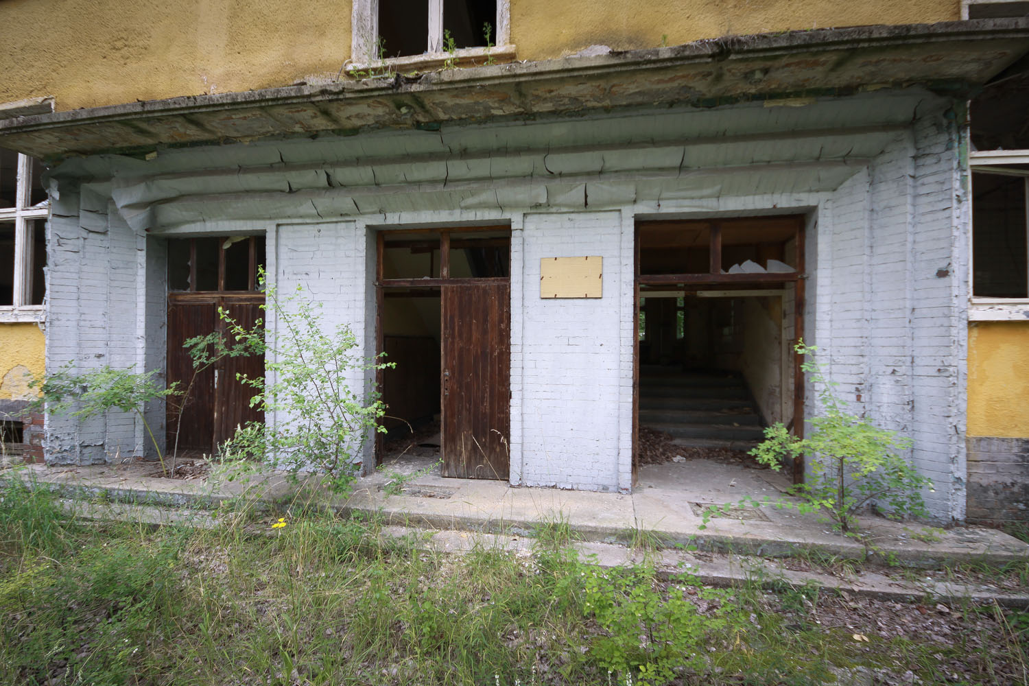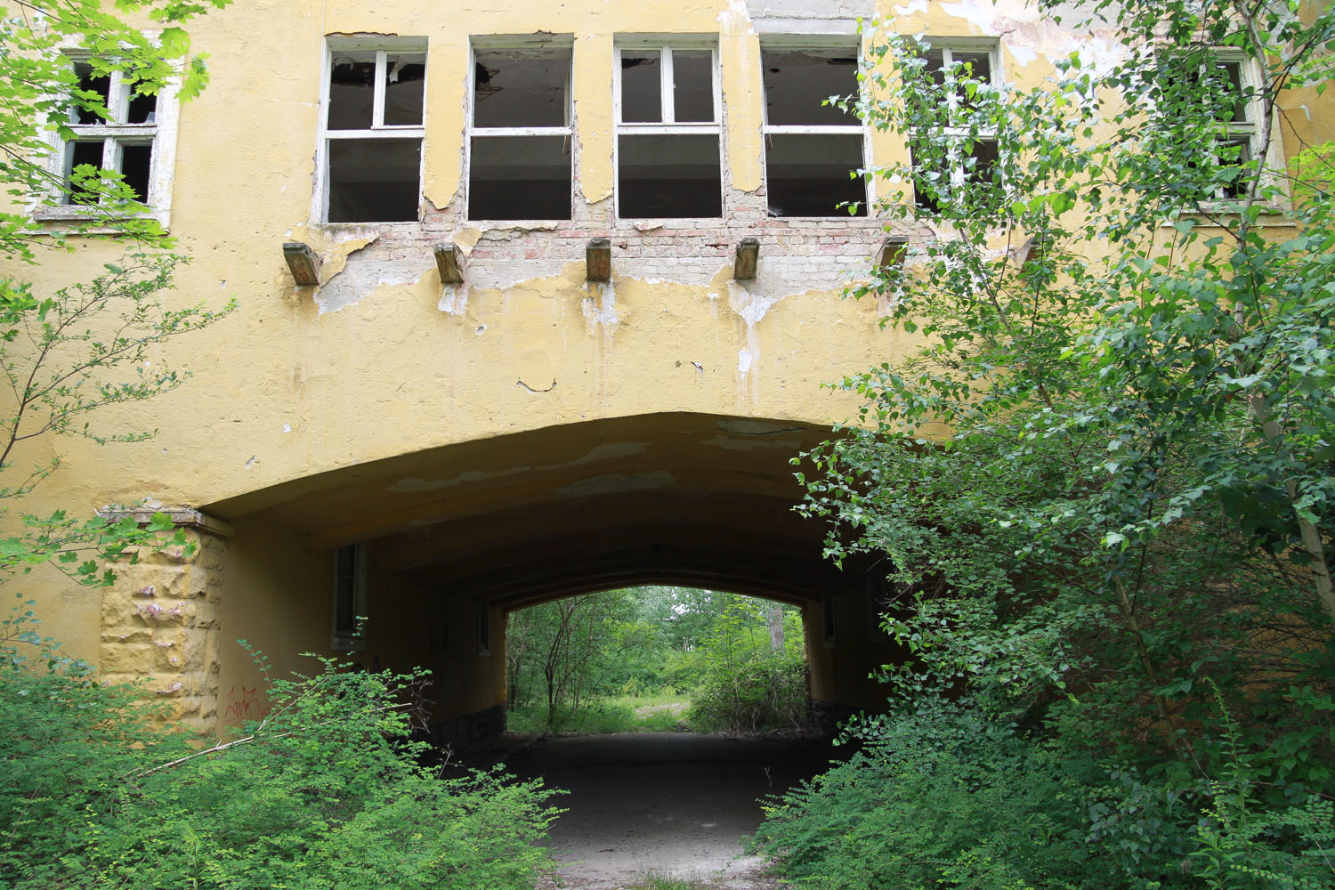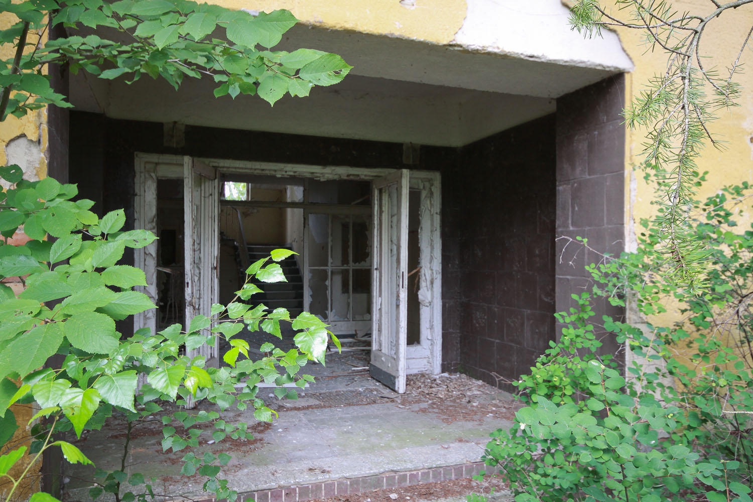 Wenn man genau hinsieht, kann man die Konturen des abgemeißelten Reichsadlers immer noch erkennen. Dies war die Haupteinfahrt zur Kaserne, rechts gab es noch ein Wachgebäude.