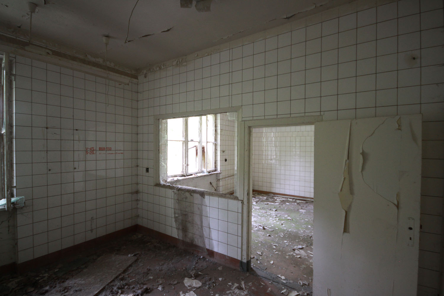 In den Küchen finden sich noch die originalen Fliesen aus den 30er Jahren. Die lackierten Türen sind irgendwann mal ohne Anschleifen übergestrichen worden, deswegen blättert die - vielleicht auch ungeeignete? - Farbe wieder ab.