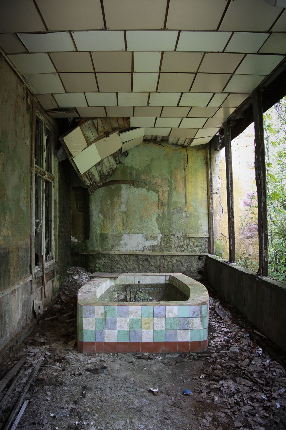 Auf der Veranda: ein gefliestes Becken, vielleicht ein Springbrunnen?